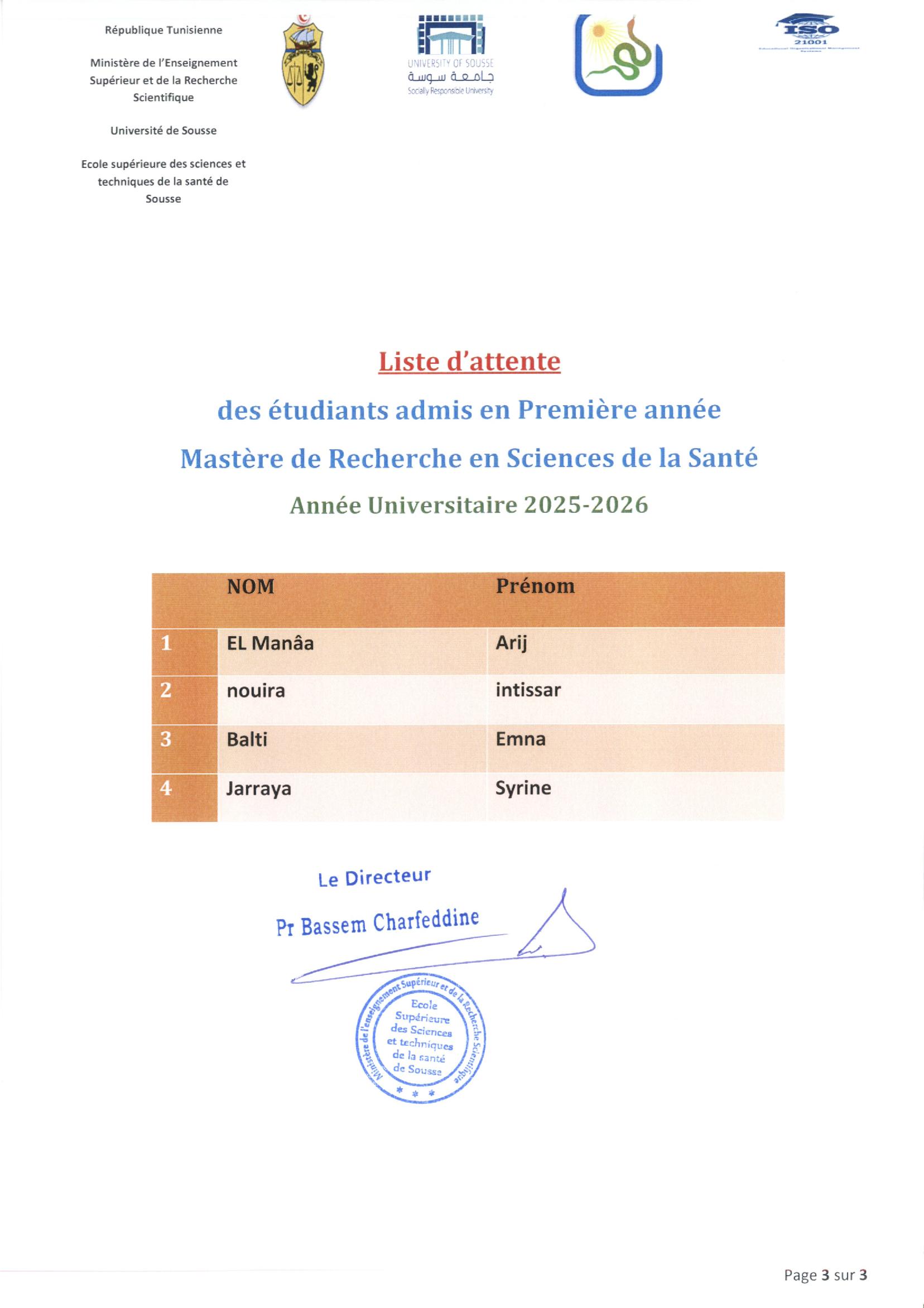 Liste d’attente des étudiants admis en Première année Mastère de Recherche en Sciences de la Santé Année Universitaire 2025-2026