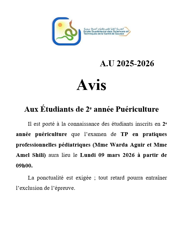 Bienvenue sur le nouveau site de l'Ecole Supérieure des Sciences et Techniques de la Santé de Sousse